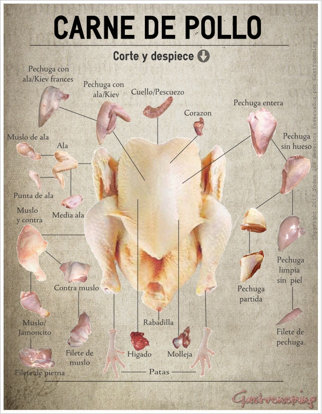 Al despiezar un pollo, se separa en varias partes principales, comenzando por dividirlo en cuartos delanteros y traseros.